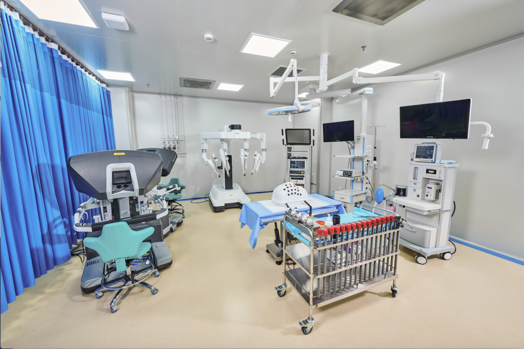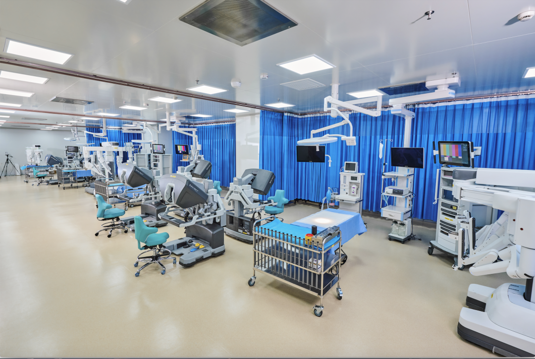 其中,外科手术室面积330平方米,配备有全系列的达芬奇手术机器人及支气管镜机器人,以及专业的联动手术床、能量平台、麻醉机等医疗设备,可同时开展6台达芬奇手术培训。除此之外,中心还配有可容纳40人的培训教室,两间多媒体会议室、餐厅、茶歇区、母婴室和更衣室。通过完善的设施与服务,为培训人员及内部员工打造一个良好的交流、服务、合作平台。