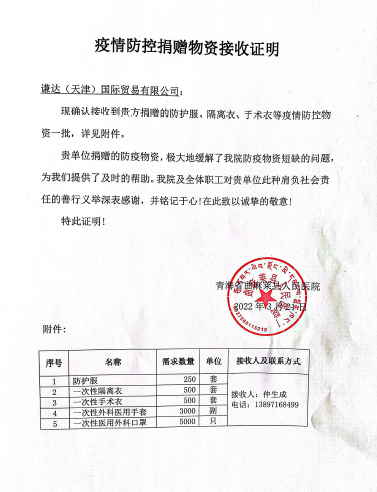 目前,包括250套防护服、500套一次性隔离衣、500套一次性手术衣、3000副一次性外科医用手套和5000只一次性医用外科口罩在内的全部捐赠物资已由青海曲麻莱县人民医院接收。物资已全部存至仓库,后期将根据疫情防控情况逐步分发给各乡镇。疫情防控物资接收当天,青海曲麻莱县主管卫生工作的李海兰副县长委托院方向谦达(天津)国际贸易有限公司及公司领导表示感谢。